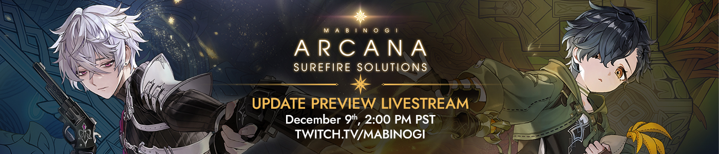 Join Community Managers Arciellia and Elebon as they go over the details of the upcoming Arcana: Surefire Solutions content including two new Arcanas, a new Rabbie Phantasm Dungeon difficulty, new events, sales, and more! Join us on our Twitch and YouTube channels, Tuesday, December 9th at 2:00 PM PST (5:00 PM EST). As always, there will be giveaways throughout the stream!