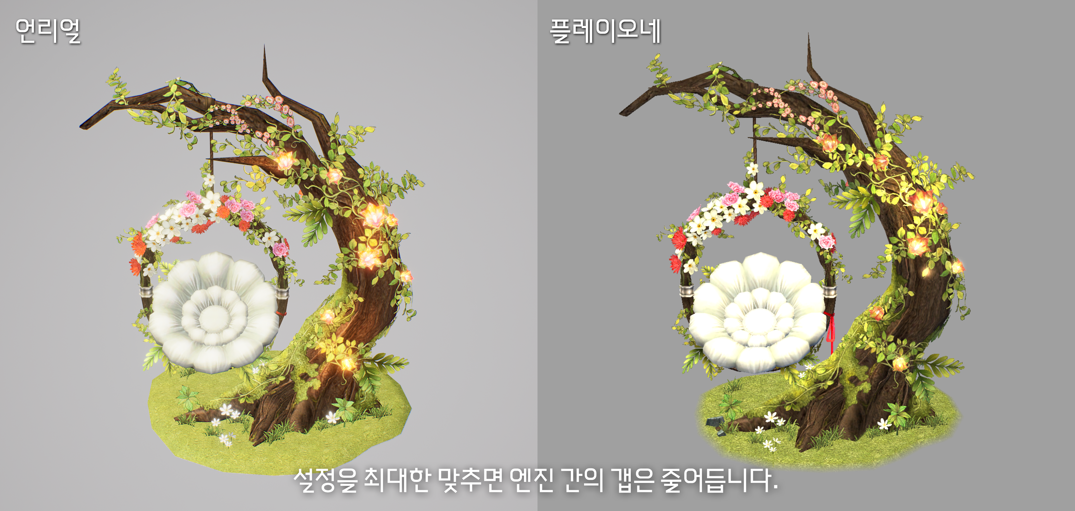 엔진이 근본부터 다른 점이 많이 있다 보니 같은 리소스인데도 매우 다른 룩을 보여주었습니다.
