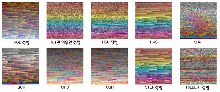 5.Hilbert 정렬 : 프랙탈처럼 소용돌이치는 선에 따라 점을 나열하고, 가지고 있는 RGB 데이터를 점의 순서대로 정렬하는 방법 (정렬이라기보다는 색상 분포 방식에 더 가까워 보였습니다.)