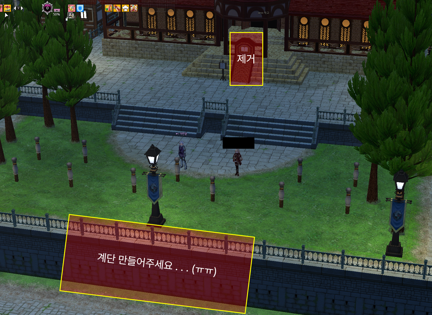 월요일에 고급 가죽을 사려고 바쁘게 관청  모험가 인장 상인을 찾아갈 때 양옆으로 나누어진 좁은 계단에 걸려 버벅대던 밀레시안이 비단 저뿐만은 아니리라 믿습니다. 가운데를 막고 있는 퀘스트 게시판이 시야를 가려 답답했던 부분도 있었고요.