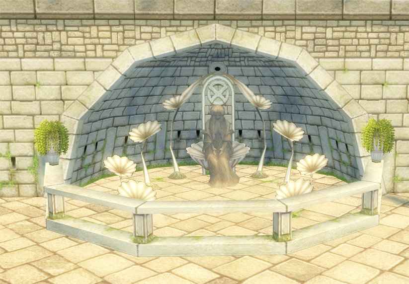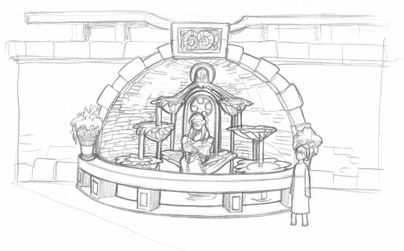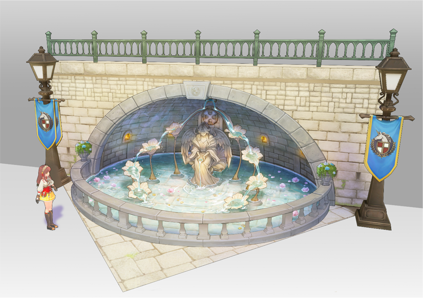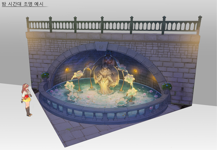 라이미라크의 자애로움이 느껴질 수 있도록 무드를 잡고, 이 분수대의 분위기가 밤에도 살았으면 하여 촛대를 놓고 분위기를 더해 주었습니다.
