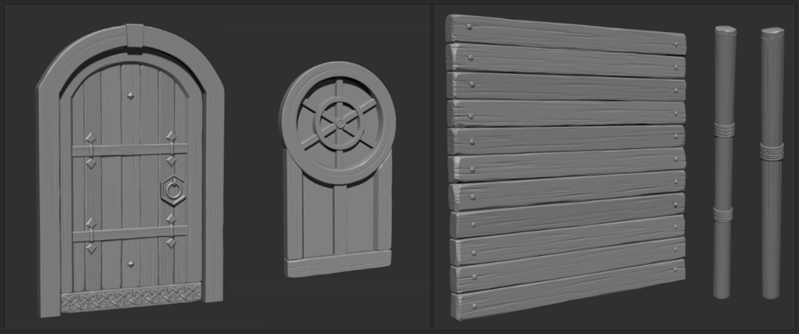 스컬프팅(그래픽툴을 사용하여 조형)에서는 큰 덩어리, 모서리 부분을 깔끔하게 처리하고 나무 질감 부분은 큰 크랙 정도만 넣기로 했습니다.